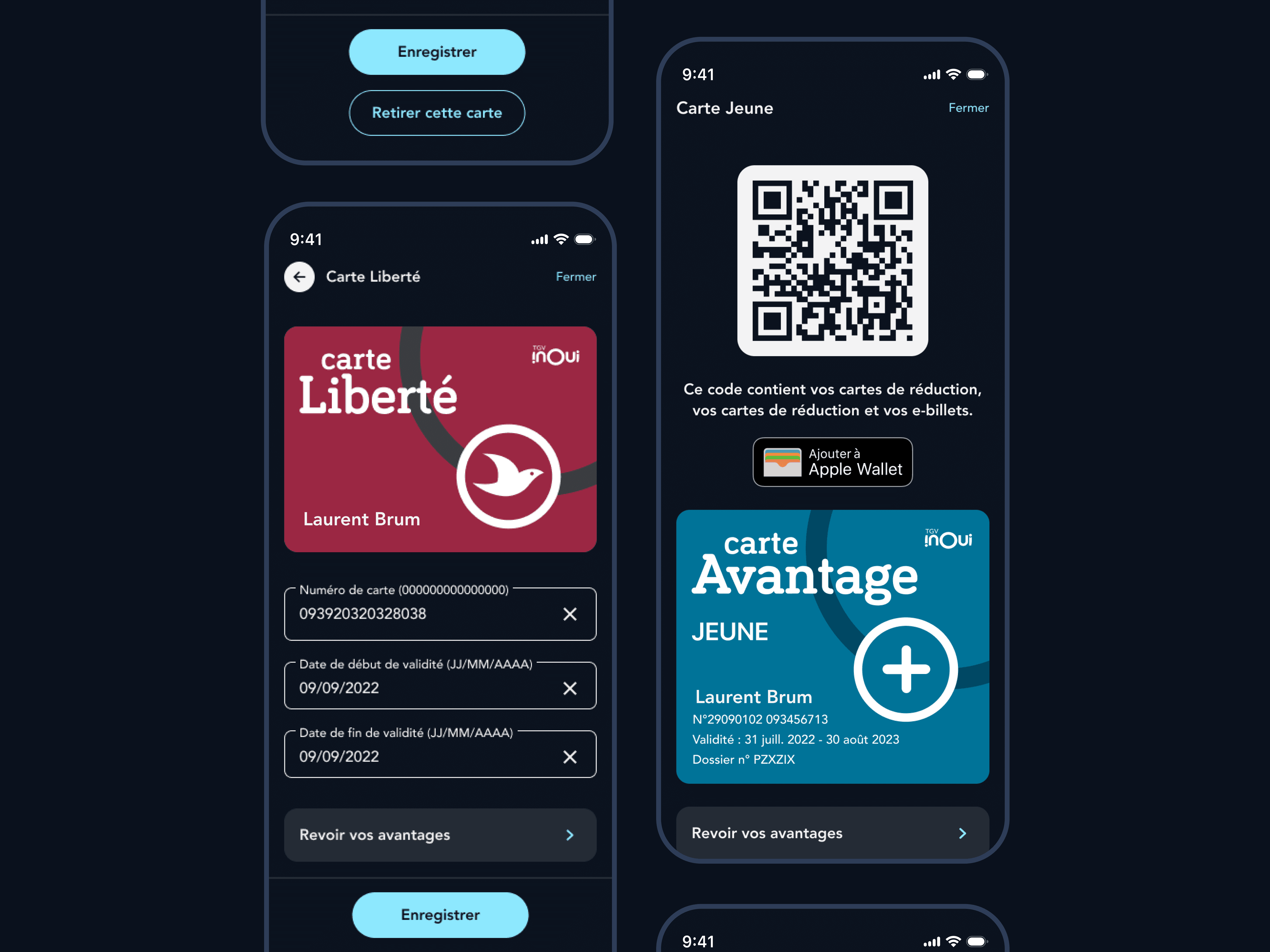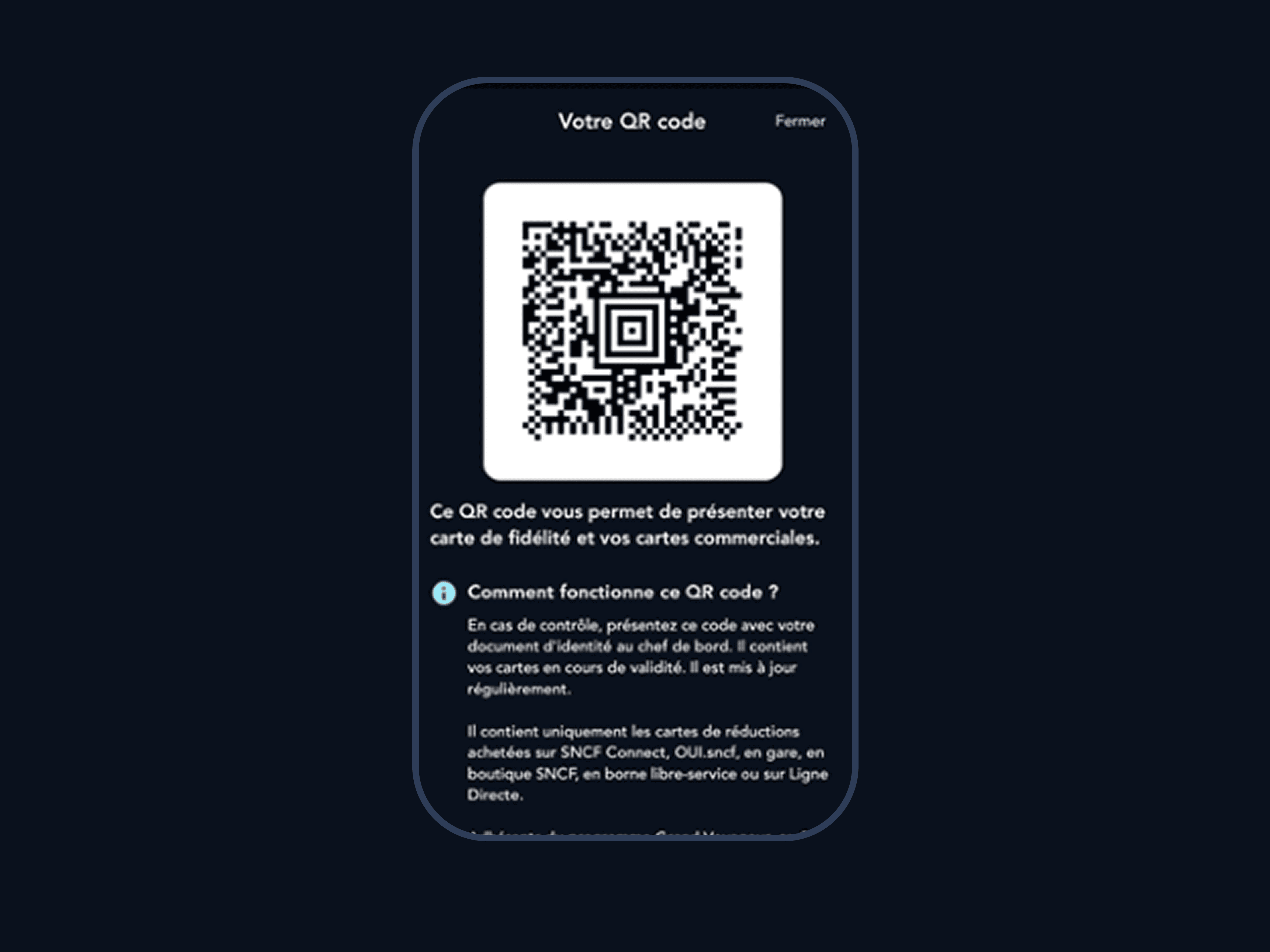 Par ailleurs, la rubrique du QR code unique, qui regroupe billet et cartes, devait être repensée selon le statut de la carte (dématérialisée avec vérification d’identité via TGV INOUI, ou simplement digitalisée), tout en accompagnant les utilisateurs vers la dématérialisation.