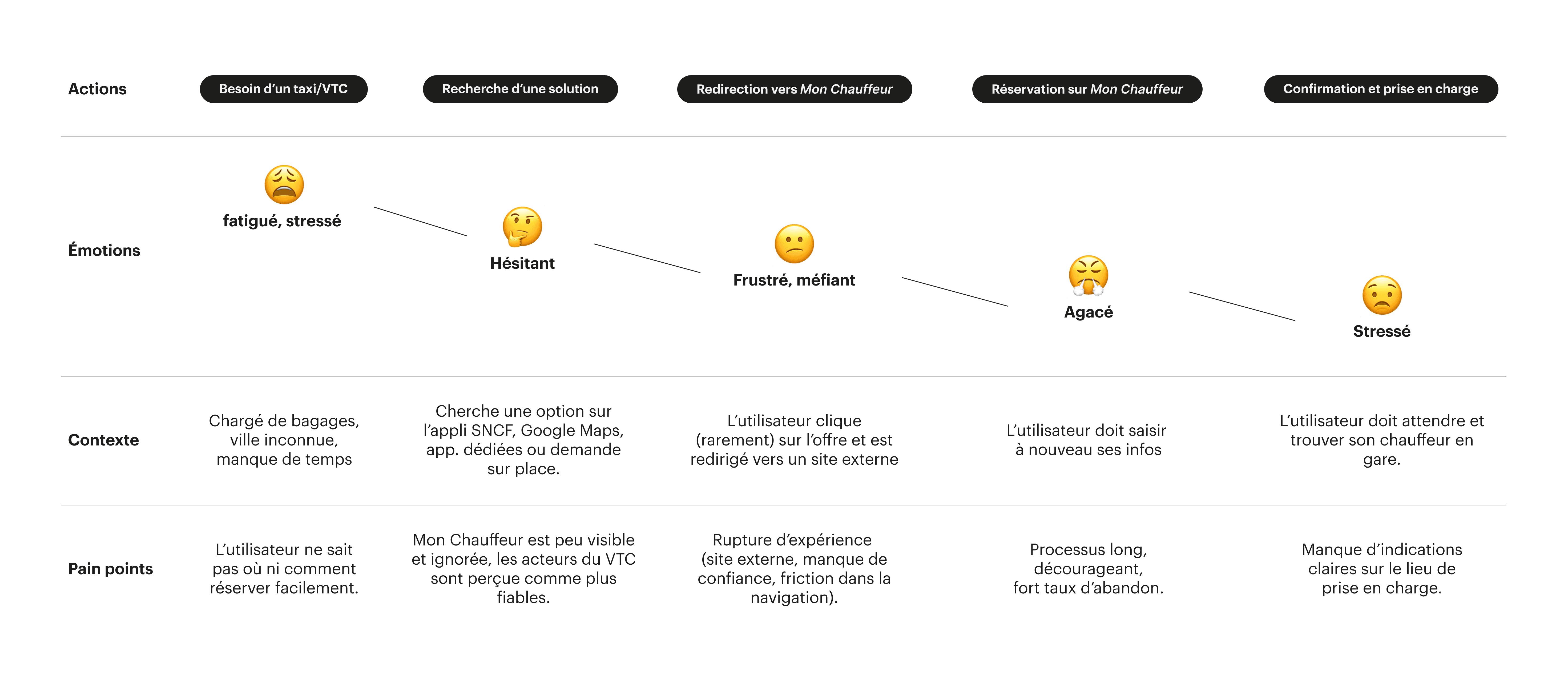J’ai mené une phase de recherche utilisateur qualitative et quantitative en collaboration avec les UX researchers et data analysts : études partenaires, focus group, analyse des parcours sur l’app vers Mon chauffeur (via content square / adobe analytics), verbatims et tests terrain en gare (guerilla).